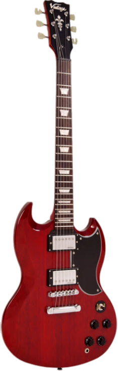Classic SG style electric guitar with cherry finish mahogany body. Mahogany neck with rosewood fingerboard. Wilkinson pick-